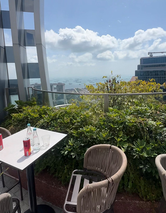 Die Aussicht vom CapitaSpring ist wirklich atemberaubend – und das Beste: Es waren kaum Touristen oben, nur ein paar Anzugträger, die offenbar gerade ihre Pause im Grünen genossen. Besonders beeindruckend fanden wir den Blick aufs Meer mit den unzähligen Containerschiffen, die vor dem Hafen Singapurs auf die Einfahrt warten. Singapur hat nach Shanghai (China) den zweitgrößten Containerhafen der Welt – entsprechend viel los ist draußen auf dem Wasser.