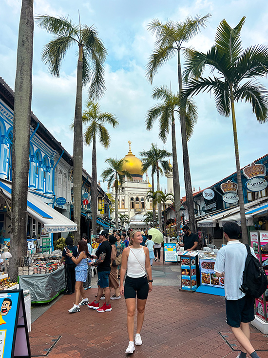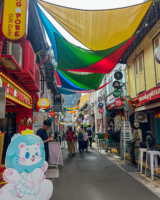Die Gegend Sultan Mosque fühlt sich komplett anders an als Marina Bay: orientalische Atmosphäre, bunte Häuser, kleine Boutiquen, Cafés und die berühmte Haji Lane, die für Street Art und kreative Shops bekannt ist.